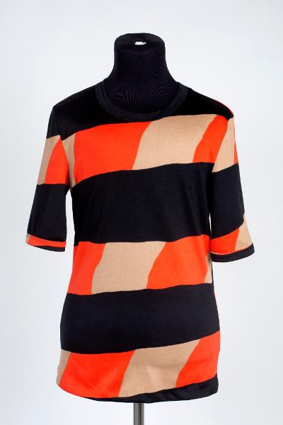- T-shirt i mönstret TRACK av Hans Krondahl, i röd-beige-svart. ”Qiana by Du Pont”. Rund halsringning. Påsydd lapp i linningen: ”SR Kostymförrådet i Malmö”. Modell: 1883, kvalitet:5524, färg: 1 (röd-beige-svart).