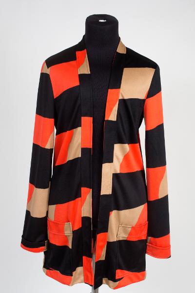 - Långärmad kofta i mönstret TRACK av Hans Krondahl, i röd-beige-svart. 2 utanpåliggande fickor, öppen utan knäppning. ”Qiana by Du Pont”. Påsydd lapp i linningen: ”SR Kostymförrådet i Malmö”. Modell: 1795, kvalitet:5524, färg: 1 (röd-beige-svart).