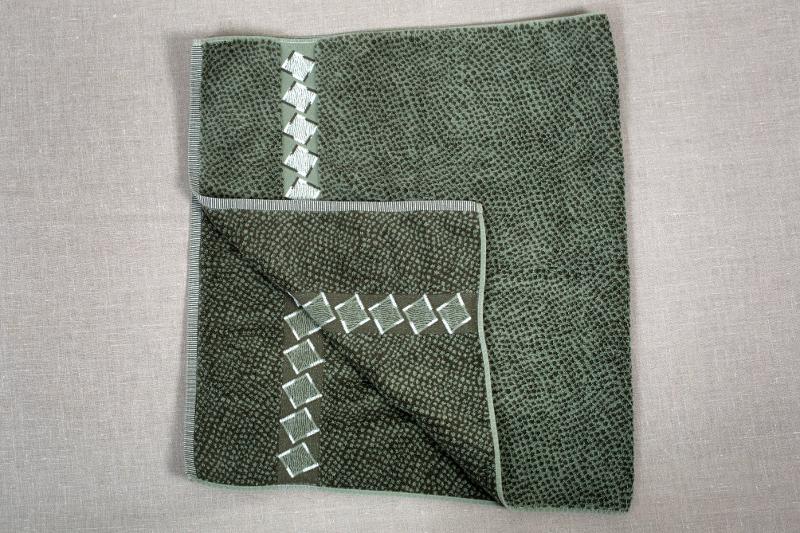 Grönt småprickigt badlakan i bomullsfrotté med vitt rutmönster i 2 bårder. Vit/grön randig bård längs med kortsidan. Made in Portugal