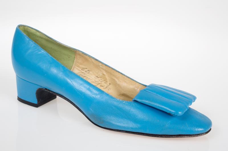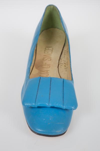 Blå öppen skinnsko med bred klack, 4 cm hög. Beige och ljusgrön insida. Högersko. Inskription i guld i innersulan: ”KATJA OF SWEDEN”. Skrivet med bläckpenna på insidan: ”6B Kil04(?) G?ons(?) L & 480”.