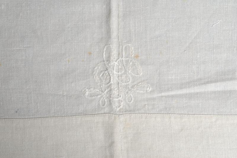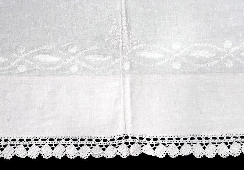 Örngott: Linne. 1) Runt kanterna vita broderier i plattsöm, kråkspark, efterstygn, i vågband, spetsovaler och punkter. Kantat med virkad vit uddspets, 3,5 cm bred. På långsidan, intill broderierna, vitt monogram i kråkspark och efterstygn "LL". Öppet vid samma långsida med 4,5 cm bred fåll. 4 par knytband. Maskin- och handfållat.
