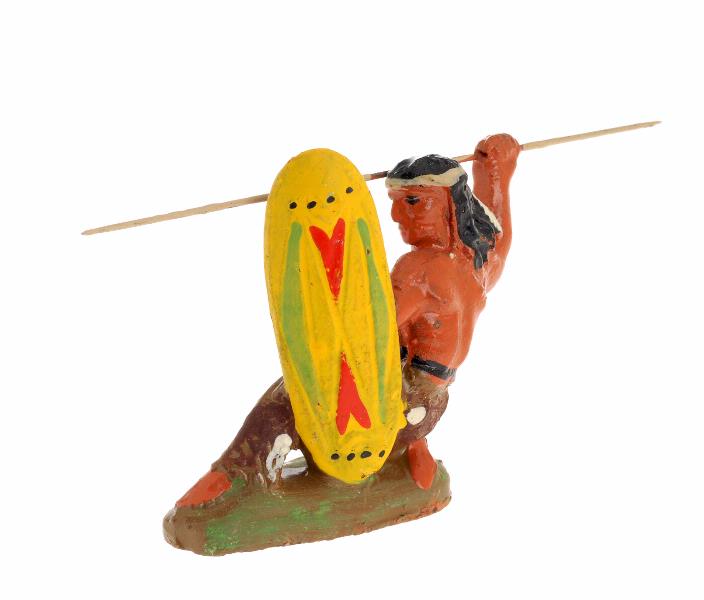 - 1 squaw (indiankvinna) med papoose (barn) buret på ryggen, klädd i fransad kjol målad i rött, grönt, gult, svart och vitt, blå sjal och fjäderskrud. 1 indian på huk med oval sköld i gult med mönster i rött och grönt, höjt spjut i ena handen, olivgröna byxor.