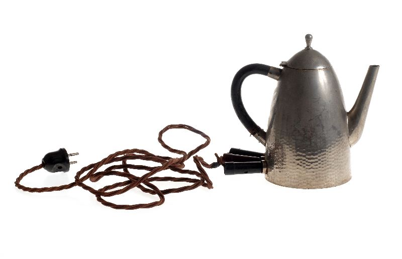Konformad med lock, av förnicklad plåt. Elektrisk med tillhörande sladd. Fastnitat handtag av trä.