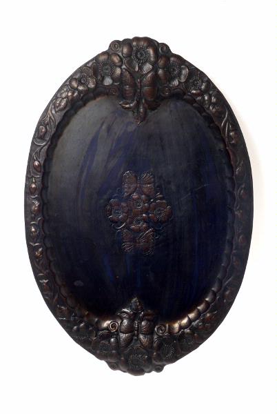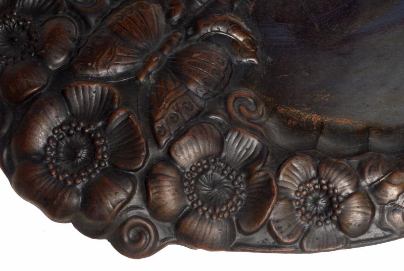 Bräm och mitt med driven dekor, blommor och fjärilar.