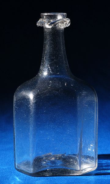 Åttkantig. Strax under mynningen pålagt en veckad glasstav. Klart glas.
