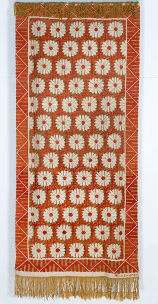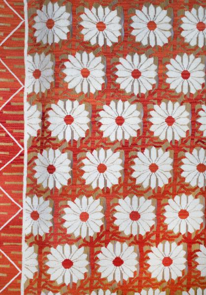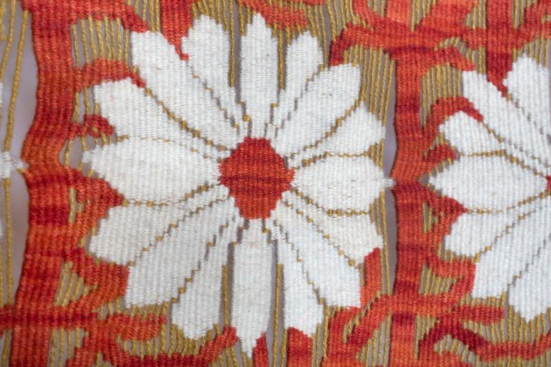 - Stora, vita, jämnt utströdda blommor mot orangerött grenverk och på gul transparent bakgrund (den gula tvinnade yllevarpen som ej är genomvävd av något inslag). Långa fransar på båda kortsidorna. Märkt * NA Bv 1898 X. (uttytt= Norske Aaklæde og Billed Væveri 1898, x-et står för nr 10 i produktionen)