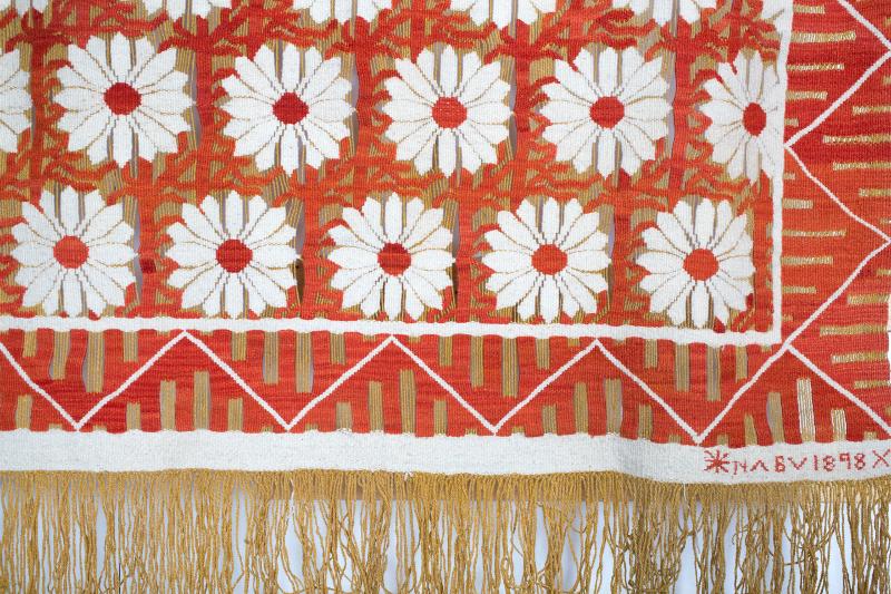 - Stora, vita, jämnt utströdda blommor mot orangerött grenverk och på gul transparent bakgrund (den gula tvinnade yllevarpen som ej är genomvävd av något inslag). Långa fransar på båda kortsidorna. Märkt * NA Bv 1898 X. (uttytt= Norske Aaklæde og Billed Væveri 1898, x-et står för nr 10 i produktionen)