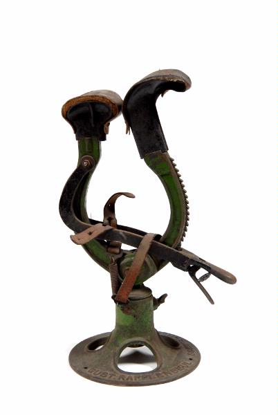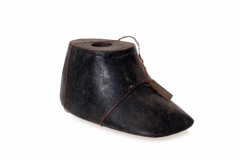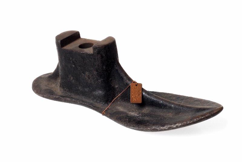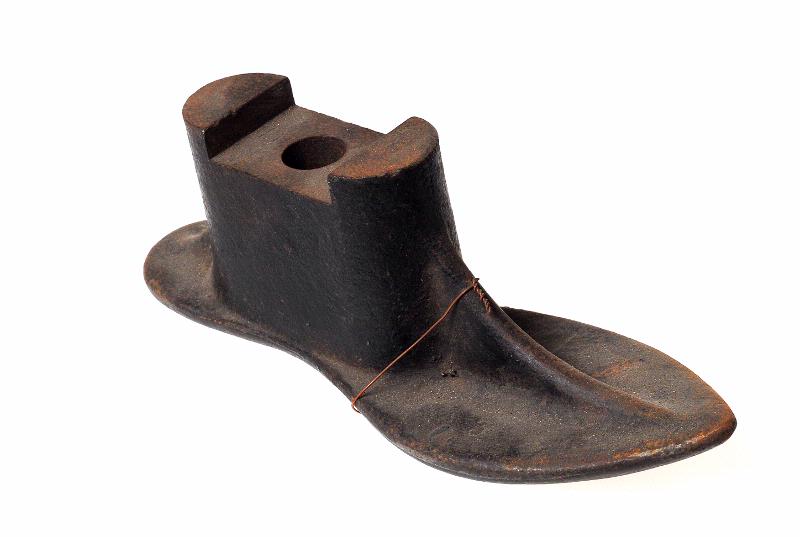 Med lösa delar, tre skinnklädda underlag till skon och tre järnläster (underlag vid spikning)