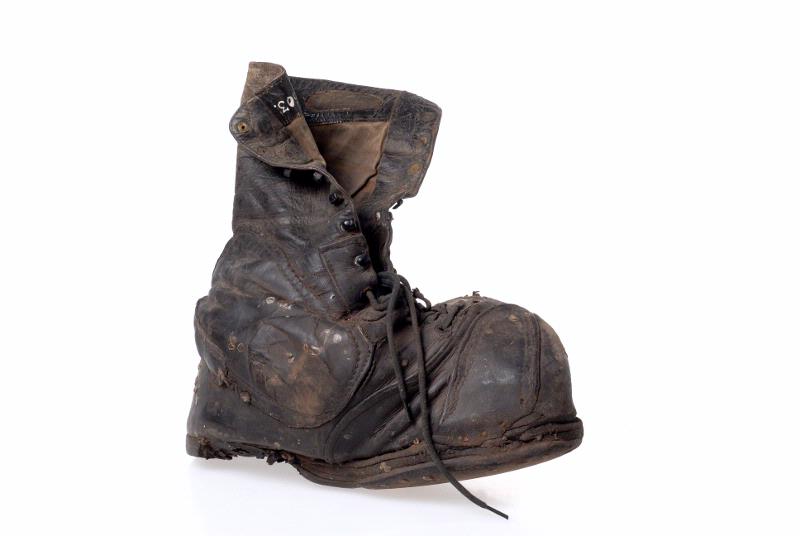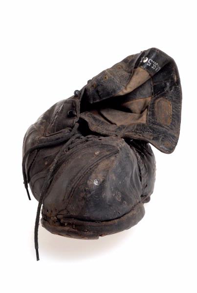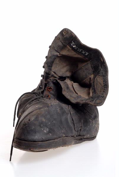 För klumpfot. Svart med högt skaft. Snörning med hål och hakar.