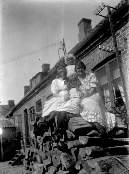 Urmakare August Anderssons fotosamling. Glasplåtarna hittades i ett växthus på tomten Kv Gärdet 6. Fastigheten har tillhört Andersson och plåtarna omhändertogs på 1960-talet, i samband med att växthuset skulle rivas. De överlämnades till Kulturen 1980 av glasmästare Ingvar Holst, Simrishamn.; Lund. Kv Gärdet 6. Damer och två flickor på vedtrave. Envåningshus byggt 1875 av trädgårdsmästare L. Andersson. Gårdssidan.