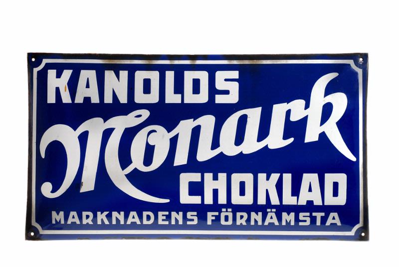 [Katalogkort saknas 19990318] Blå med vit text: "Kanolds Monark Choklad, Marknadens förnämsta".