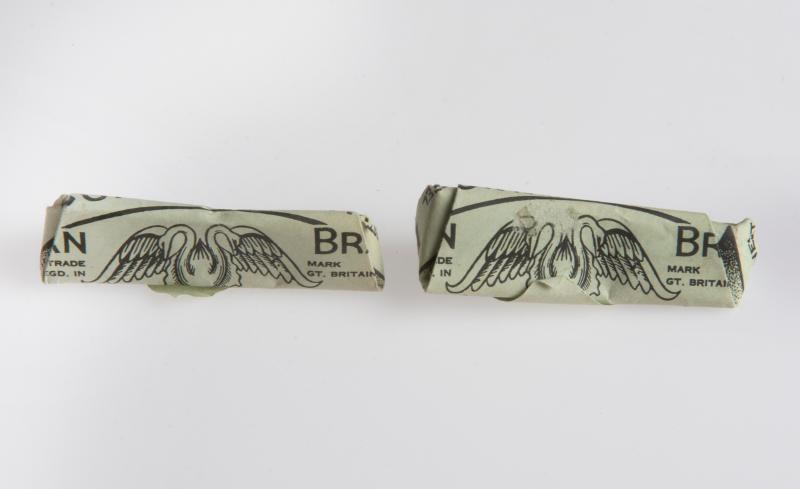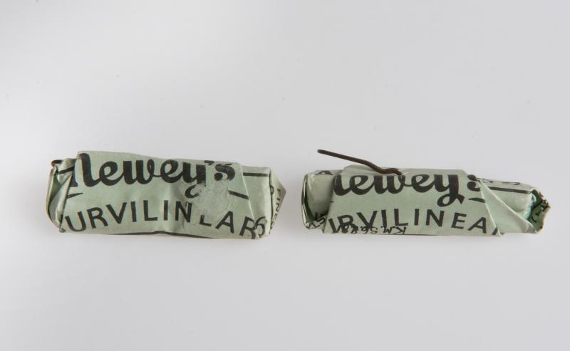 Ljusgröna pappersförpackningar: "Newey's Curvilinear Swan Brand". Innehåller hårnålar i metall.