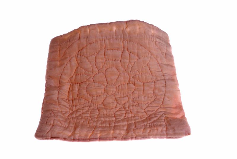 2 madrasser, vit, violblå, vadd. 2 täcken, ljusrosa, ljusblått, vadd. 3 kuddar, 1 röd, 1 vit och 1 lila/grå blommönstrad.