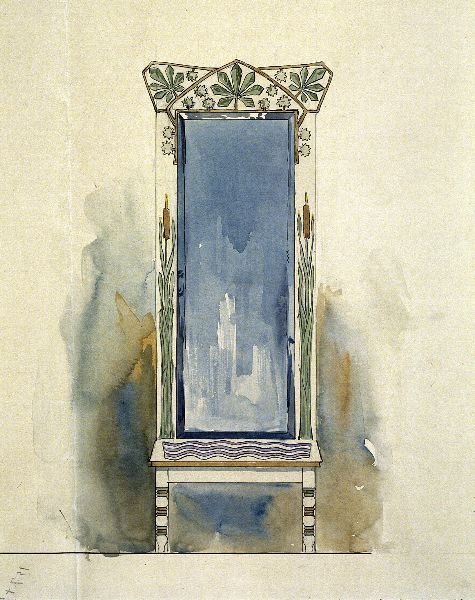 "Förlaga till väggspegel och bord i jugendstil med kaveldun och kastanjeblad som dekor...."; "Skiss till taklampa. Akvarellerad teckning av Jöns Mårtensson för Konstslöjdsanstalten på Kulturen. Odaterad, c 1907."