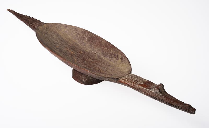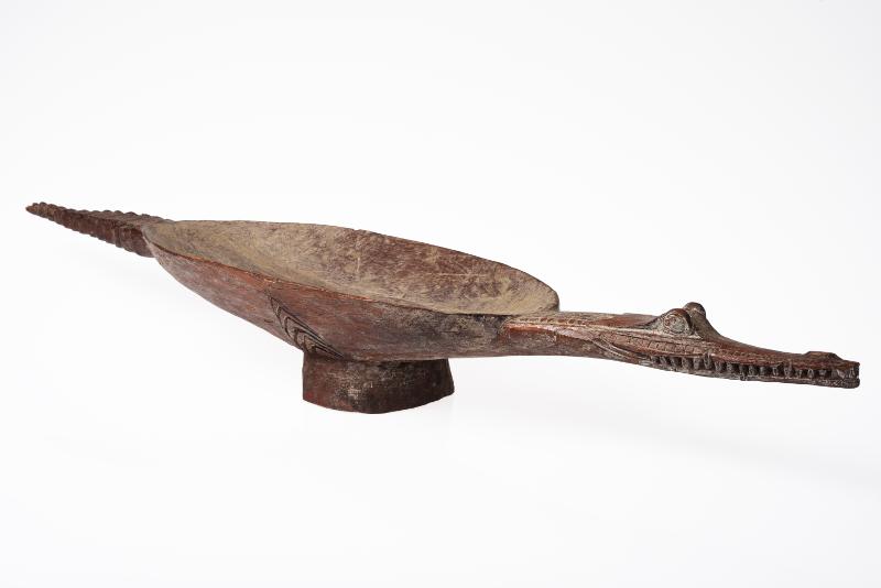 Långsmal, form av en krokodil med skulpterat huvud och stjärt stickande ut som handtag från respektive sida.