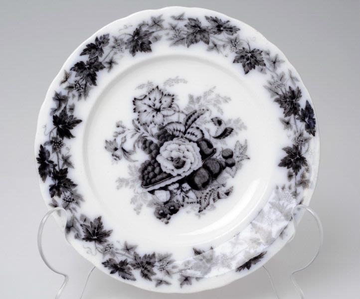 - 44 delar. Tryckdekor "Mulberry" i flytande brunt. 1 cabaret om 8 delar, mittfatet saknas 12x17 cm.; 2 karotter på fot utan lock L 30 cm H 7,5 cm; 1 runt fat mått saknas; 2 ovala fat L 37 cm B 30 cm; 1 salladière med tre skålar och mitt-grepe L 28 cm H 11 cm; 12 tallrikar Diam 24,5 cm; 18 assietter, de 11 äldre med sliten guldmarkerad kontur och kantrand, Diam 21 cm.