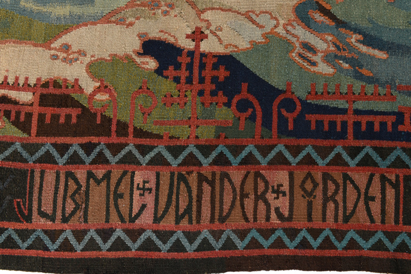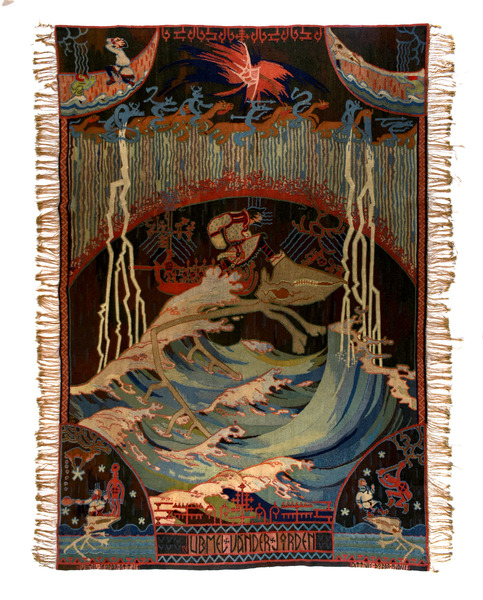 "Gobeläng, 'Jubmel vänder jorden', komponerad av Ossian Elgström, 1911. Vävd hos Den norske Husflidsförening, Kristiania. Motivet är taget från den lapska sagan om Solsönerna."