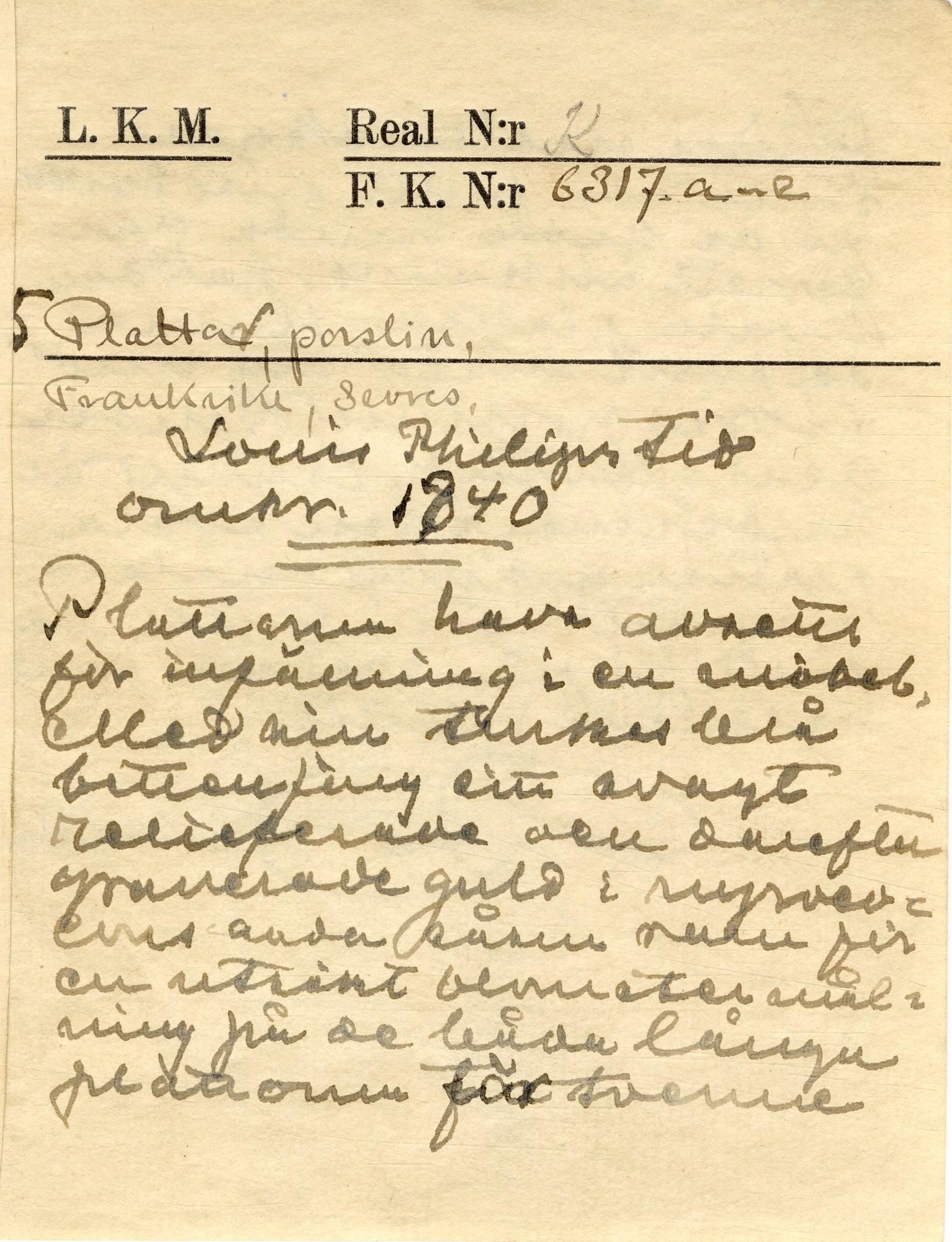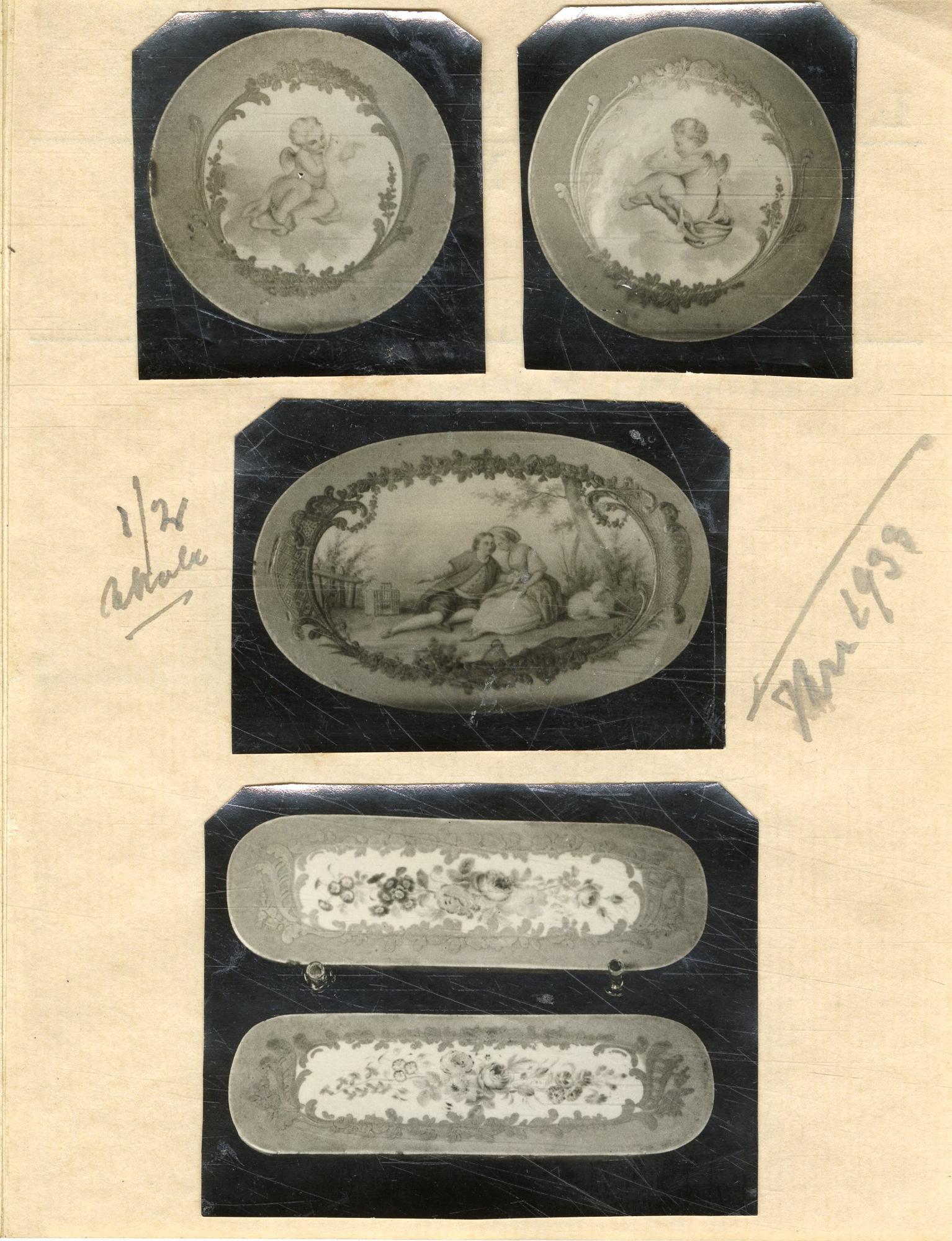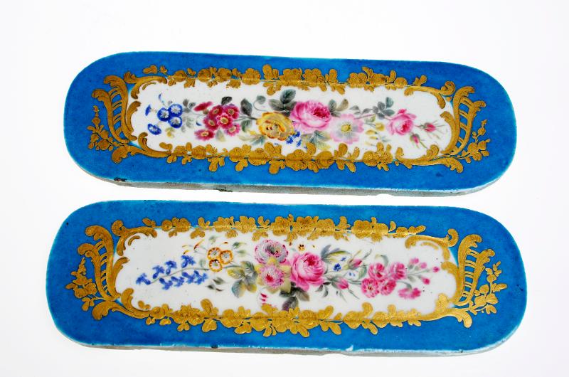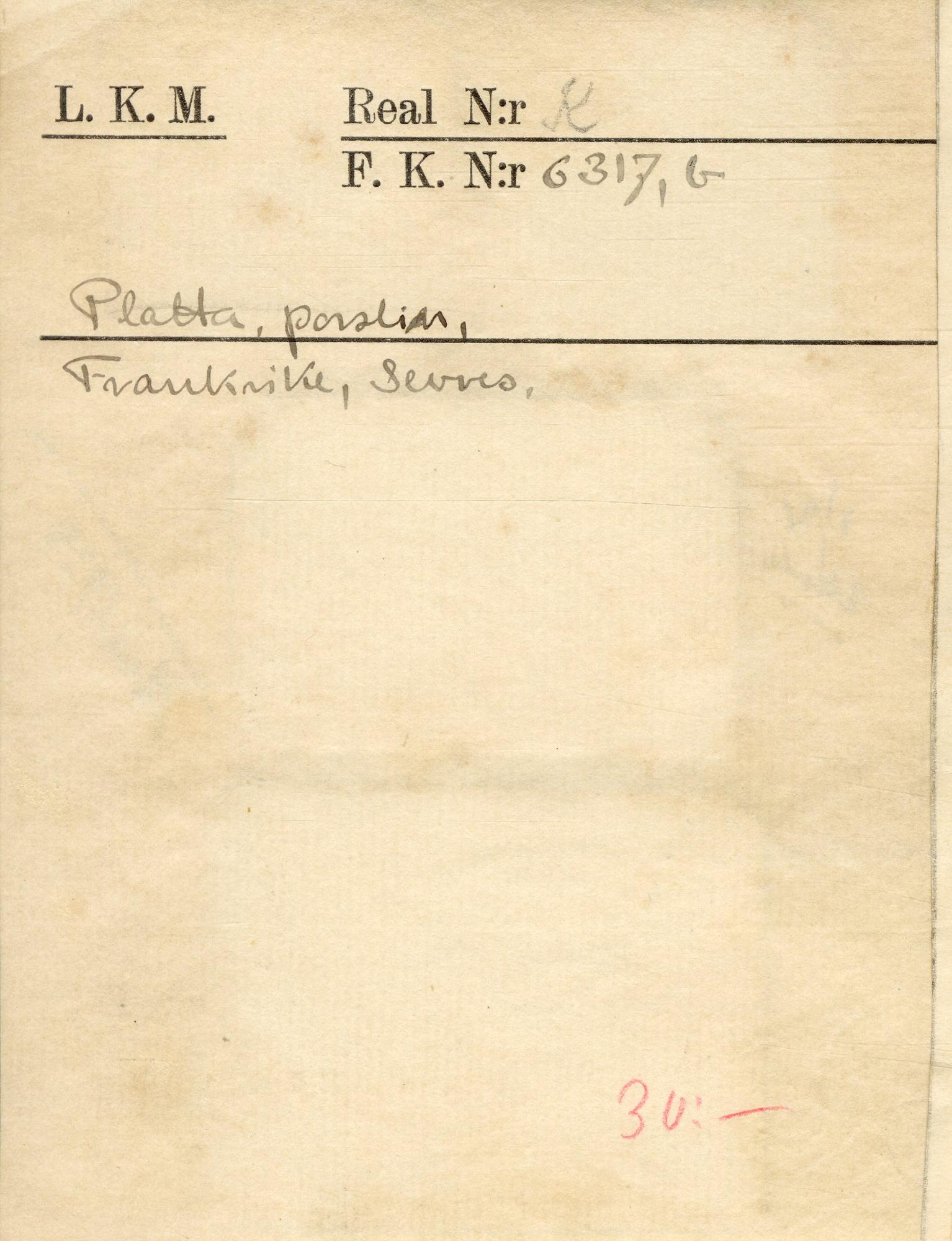 Enligt Karlins katalog 2 st plattor, endast 1 platta avbildad på katalogkort. Rektangulär med rundade hörn. Fond bleu celeste, polykromt blomstermåleri i guldkartusch.