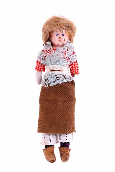 - Byxor och underklänning i vit bomull med brodyr. Blus i muslin med röda-vita "tuppfjät". Kjol brun diagonalmönstrad bomull. Strumpor i bomull, mörka, tvärrandiga. Skor i skinn. Spetssjal ljusblå. Brosch.