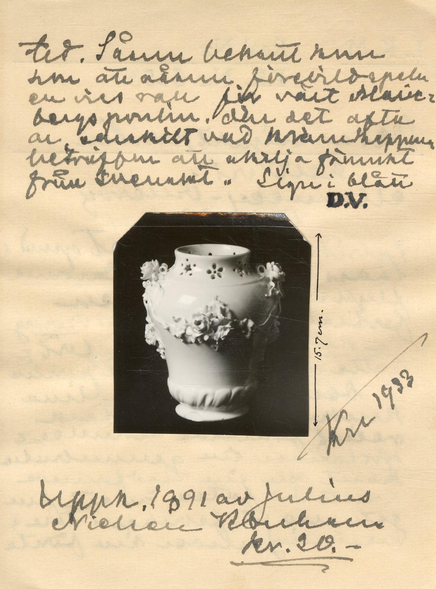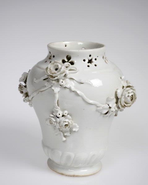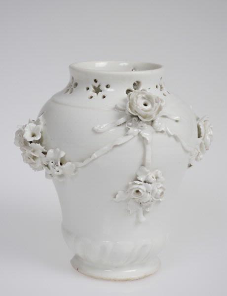 Mjukt porslin. Dekor med reliefblomster, godronnerad fot, genombruten mynning.