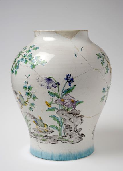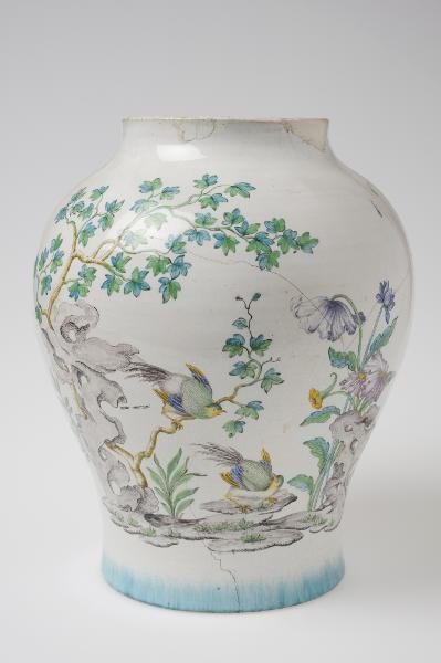 Vit glasyr med polykrom dekor, kinesiserande naturdekor: klippor, träd, blommor och fåglar; botten helt gulglaserad; mycket lagad.