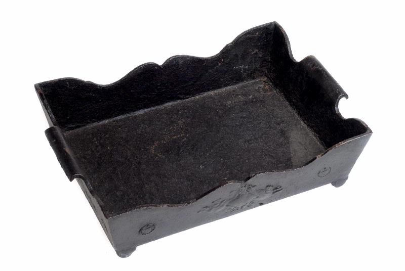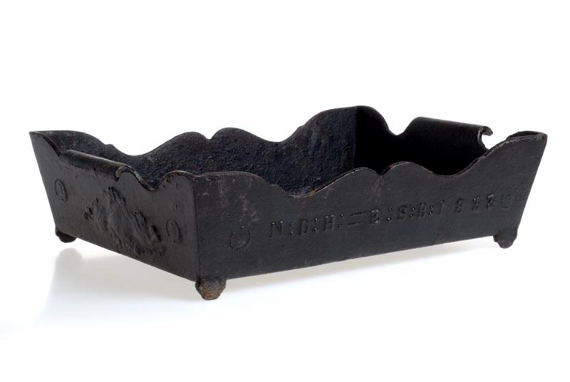 Rektangulär med något lutande sidor, vars överkanter går i dekorativa vågor. Låga reliefornament och på ena sidan "N:D:H: E:S:B:1833". På små runda fötter.