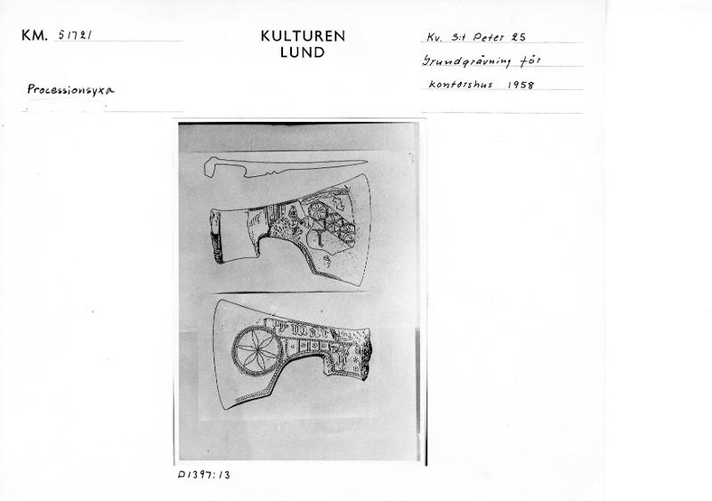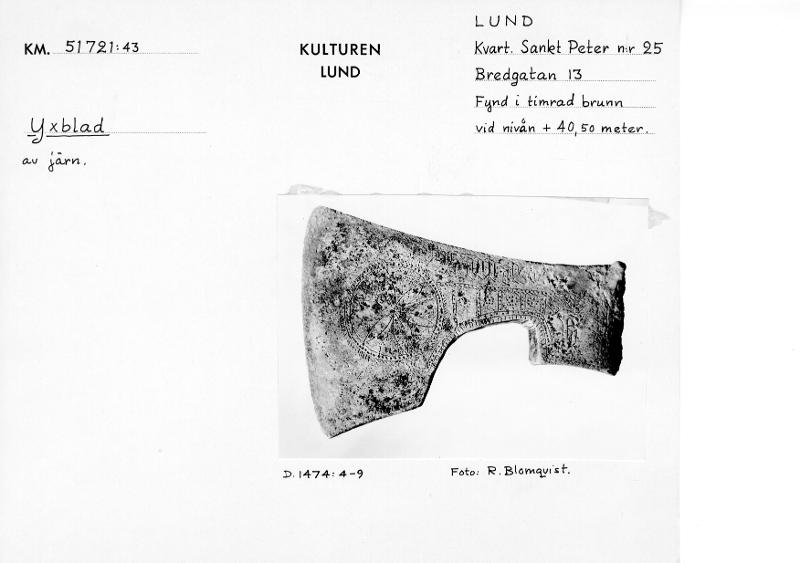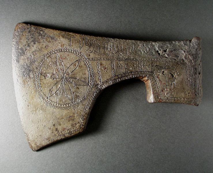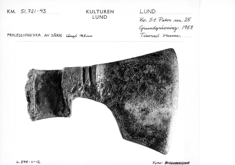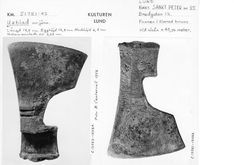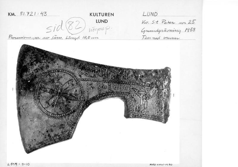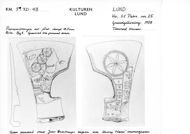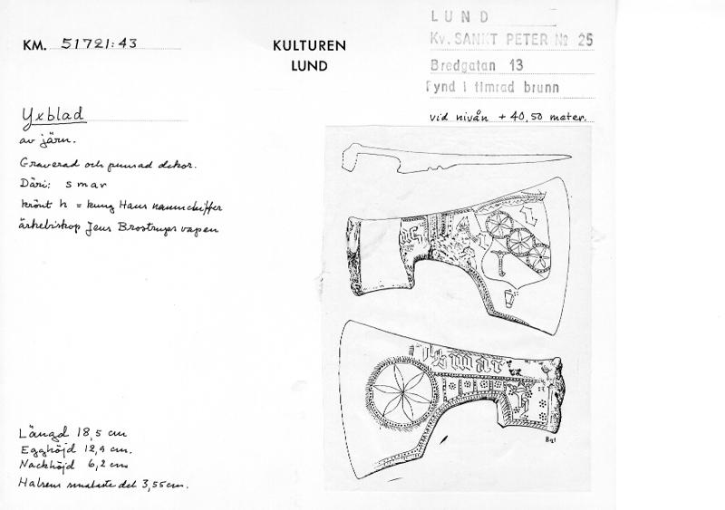 Yxblad med graverad och punsad dekor: ärkebiskop Jens Bostrups vapen och kung Hans monogram. Troligen har paradyxan burits av någon i ärkebiskopens väpnade följe. 1482-1497.