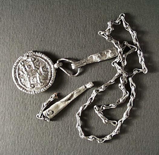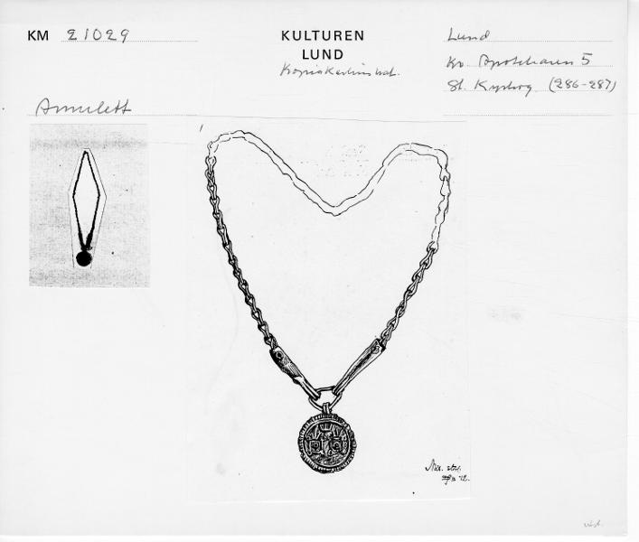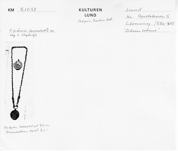 "Från Skandinaviska bankens tomt har kommit ett par spännen av tenn med tillhörande 36 cm lång kedja, bild 9. Jämte ytterliggare två i Lund funna, det ena bild 10, bilda de en liten grupp tennspännen, som uppenbarligen äro gjorda efter förebild av bysantiska mynt. På spännena bild 9 är huvudsaken i dekoren två kvadratiska figurer med små rundlar vid hörnen och några tofsliknande flikar vid nederkanten. Det kan inte vara något annat än efterbildningar av de banér, som förekommer som kejsarattribut på många bysantiska mynt från 800-1000-talen." "Det ligger närmast till hands att sätta de ifrågavarande tennspännena från Lund i samband med den våg av bysantisk påverkan, som ger sig tillkänna på Sven Estridssons Lundamynt, och spännena skulle då kunna anses vara samtida med dessa." Kulturens årsbok 1947, Blomqvist Ragnar, Spännen och söljor, s. 124-128, bild 9, s. 129.
