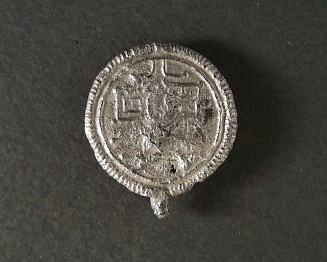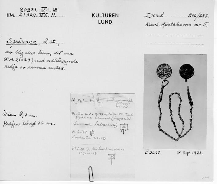 "Från Skandinaviska bankens tomt har kommit ett par spännen av tenn med tillhörande 36 cm lång kedja, bild 9. Jämte ytterliggare två i Lund funna, det ena bild 10, bilda de en liten grupp tennspännen, som uppenbarligen äro gjorda efter förebild av bysantiska mynt. På spännena bild 9 är huvudsaken i dekoren två kvadratiska figurer med små rundlar vid hörnen och några tofsliknande flikar vid nederkanten. Det kan inte vara något annat än efterbildningar av de banér, som förekommer som kejsarattribut på många bysantiska mynt från 800-1000-talen." "Det ligger närmast till hands att sätta de ifrågavarande tennspännena från Lund i samband med den våg av bysantisk påverkan, som ger sig tillkänna på Sven Estridssons Lundamynt, och spännena skulle då kunna anses vara samtida med dessa." Kulturens årsbok 1947, Blomqvist Ragnar, Spännen och söljor, s. 124-128, bild 9, s. 129.