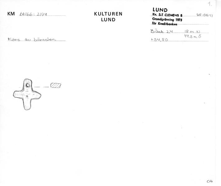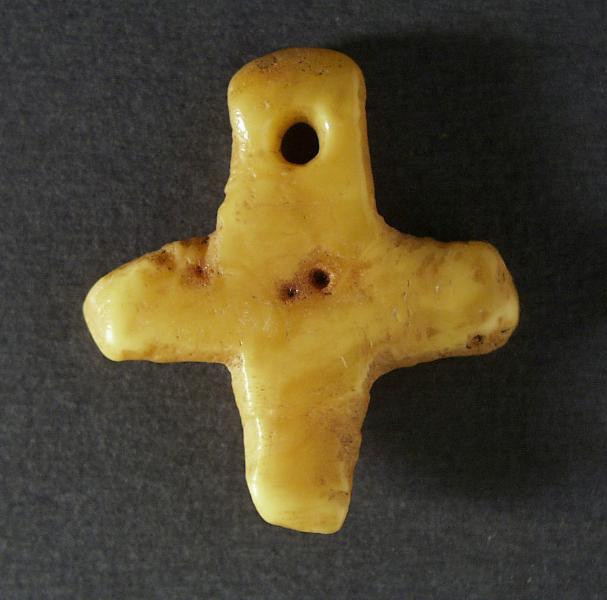 "Kors av bärnsten, ca 3 cm stort. Har burits i runt halsen eller möjligen varit fastsytt på klädesdräkten." [i årsboken benämnd KM 66166:2194]