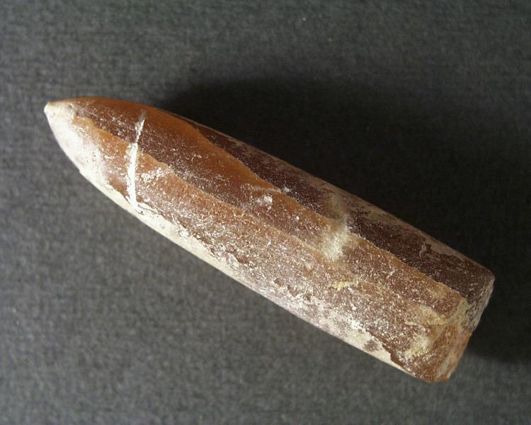 Fossiliserad spolformad bakre del av bläckfiskskal av den utdöda arten belemniter.