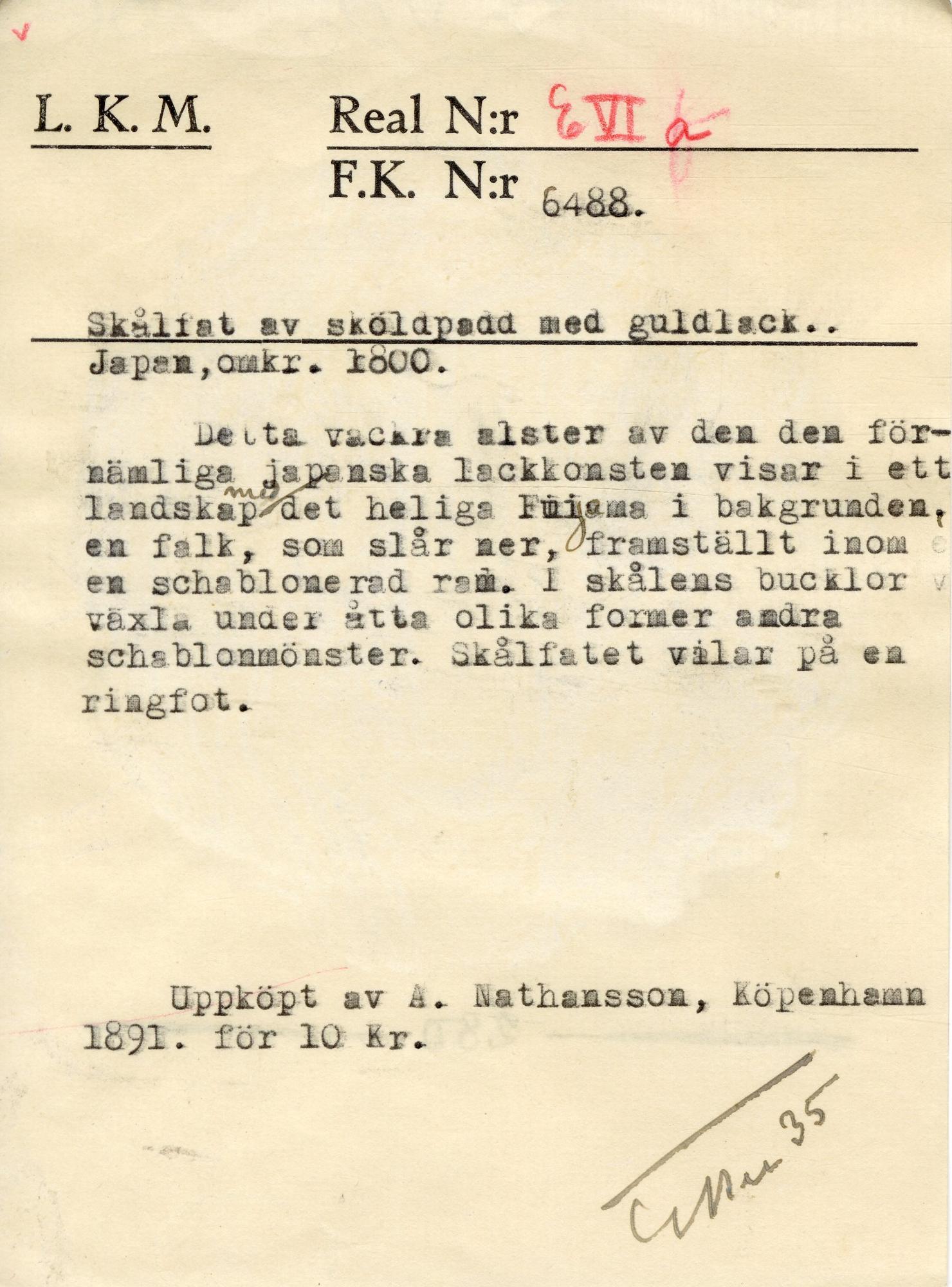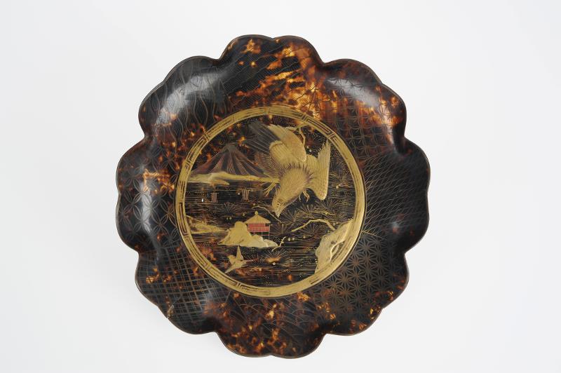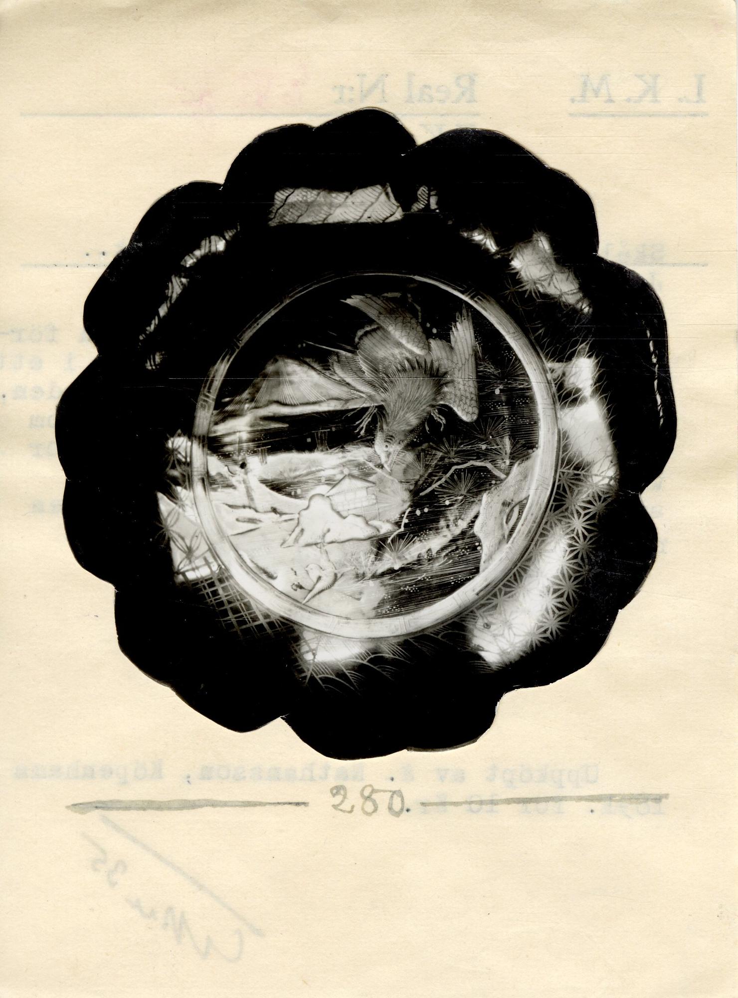 Detta vackra alster av den förnämliga japanska lackkonsten visar, i ett landskap med det heliga berget Fuijama i bakgrunden, en falk som slår ner, framställt inom en schablonerad ram. I skålens bucklor växla under åtta olika former andra schablonmönster. Skålfatet vilarpå en ringfot .- Georg Karlin 1935.