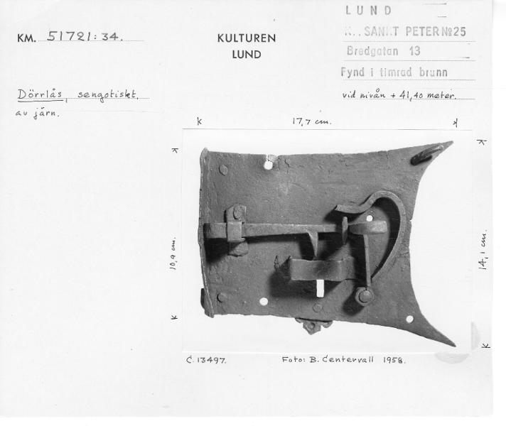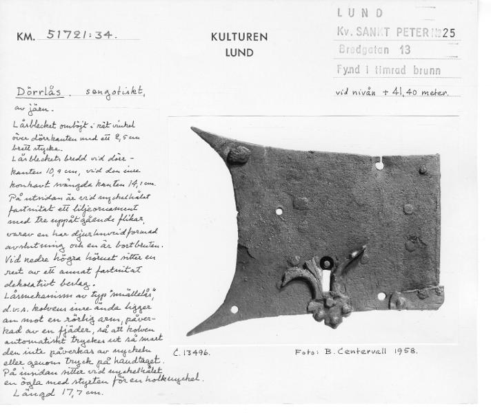 Dörrlås, s.k. "smällelås", omkring 1500.; Katalogkort.
