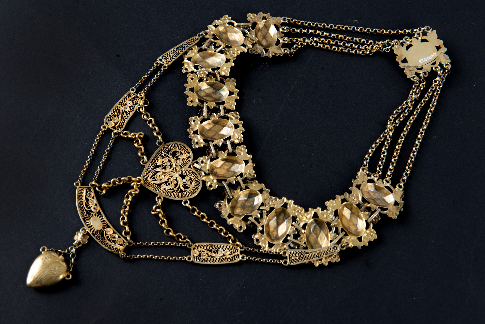 - Collier med gjutna och fasetterade prismor flankerade av pressade vindruvsklasar och hängen i filigran, det största i mitten hjärtformat med slipad glasfluss, på kedjor av ärtlänkar, mitt fram också hjärtformad luktdosa vilken är stämplad.
