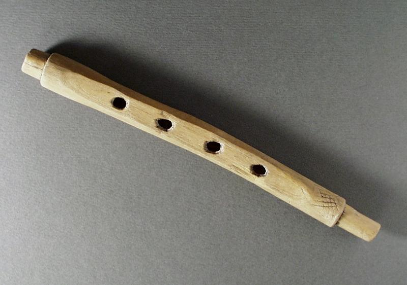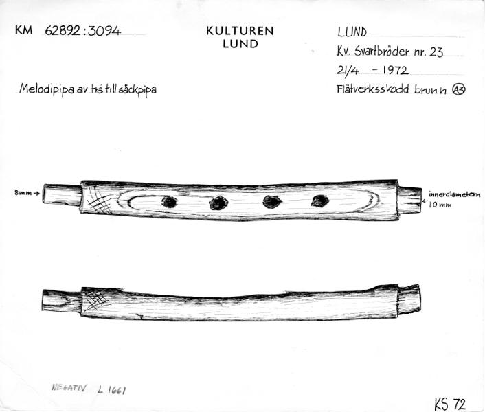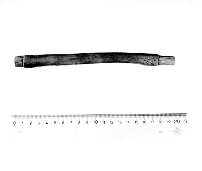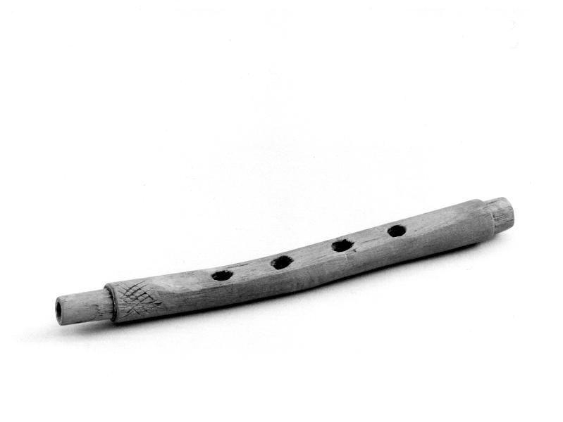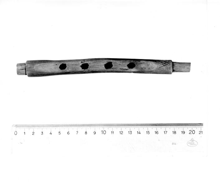 Pipa av fläder med fyra fingerhål. Ändarna är toppformigt tillskurna för fastsättandet av nu försvunna delar. Spelpipan har tillhört en säck- eller hornpipa. 1000-1100-tal.