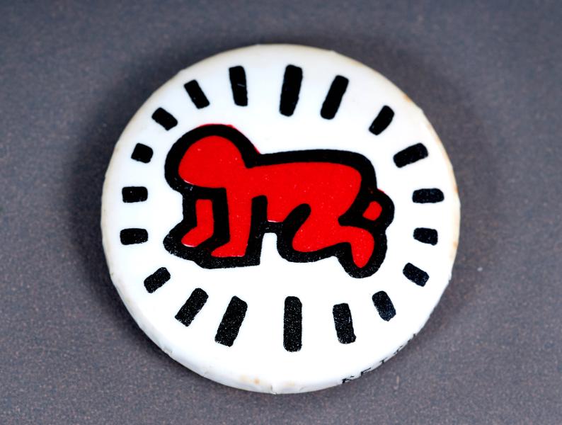Vit, svart och röd pin med motiv av den amerikanske konstnären Keith Haring. Motivet är en stiliserad människa/barn på alla fyra tryck i rött med svart kant, med svarta streck som strålar i från figuren. På sidan av pin: