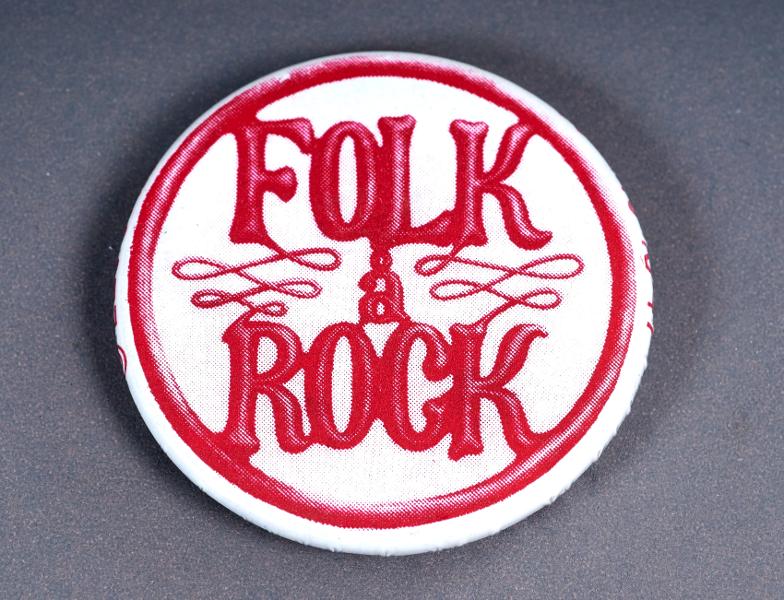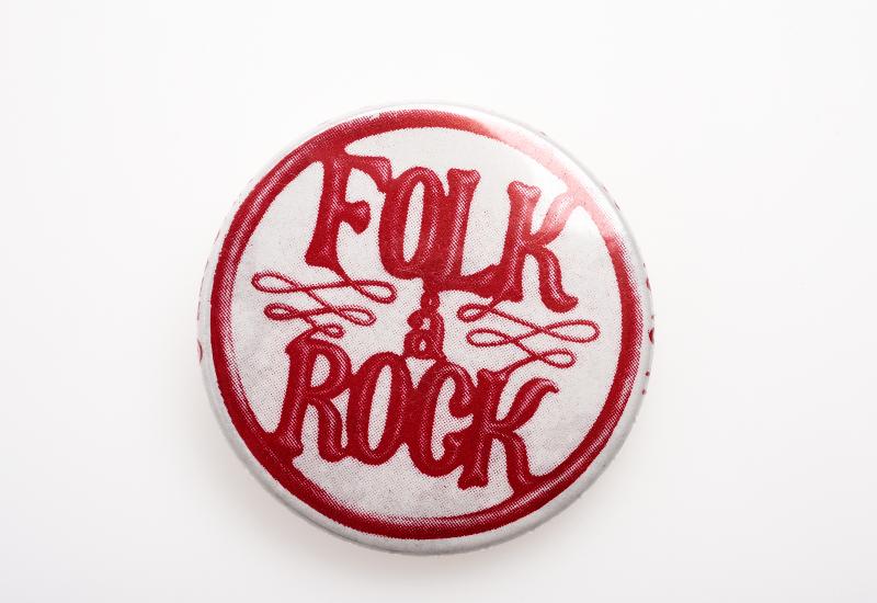 Pin i vitt och rött. Röd text "Folk å Rock". På sidan av märket tryckt i rött: "© LEJOHN - 046-1287 26, 060-46 16 41". I mellan bokstäverna F - R och K -K är röda linjer utmålade.