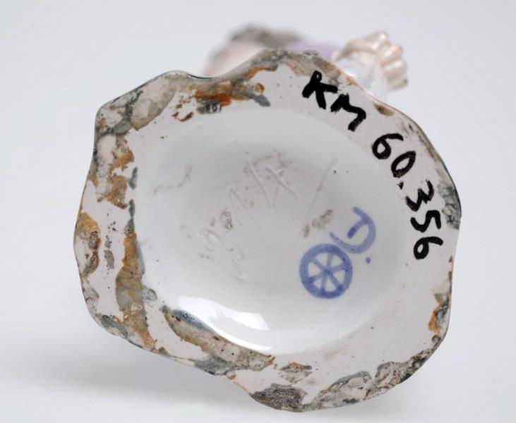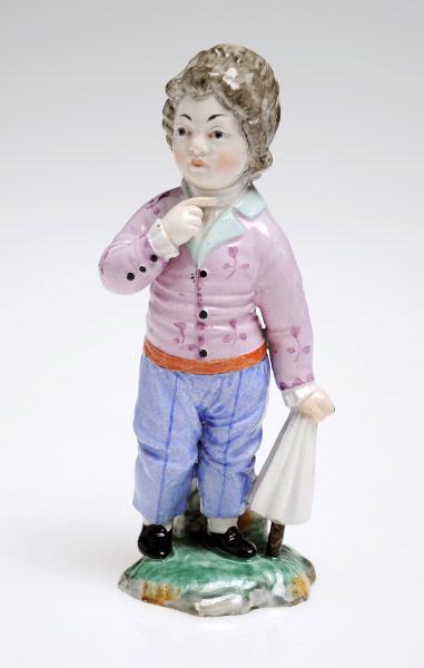 Stående gosse, stödd på paraply. Rosa rock, blå byxor, orange bälte. Låg sockel, grästuva med stubbe.