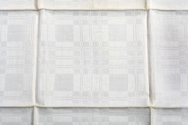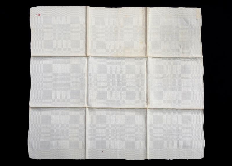 Vit. Tioskaftsdräll. Rutmönster. Märkt med röda korsstygn "MB 6" (B=Björklund).