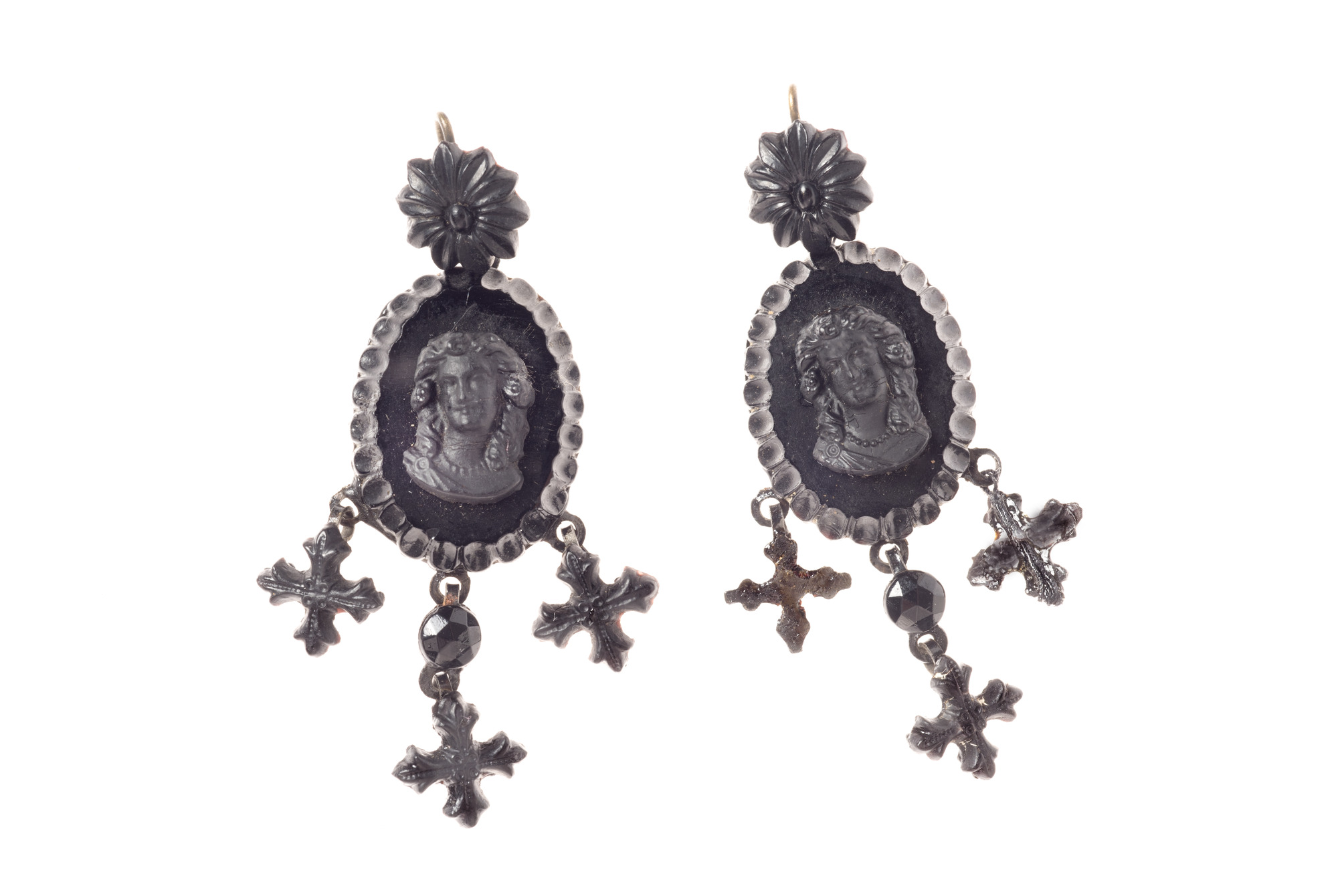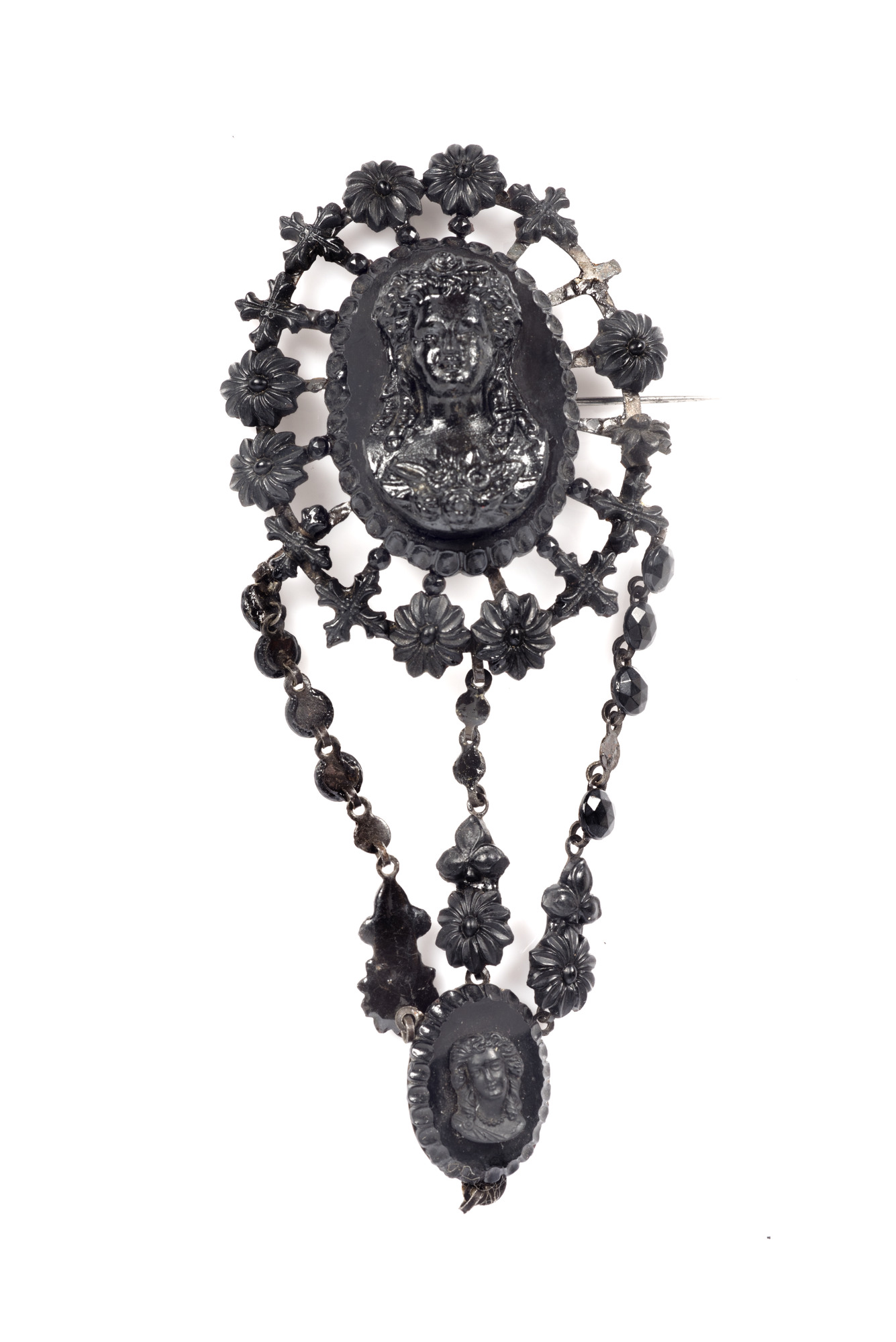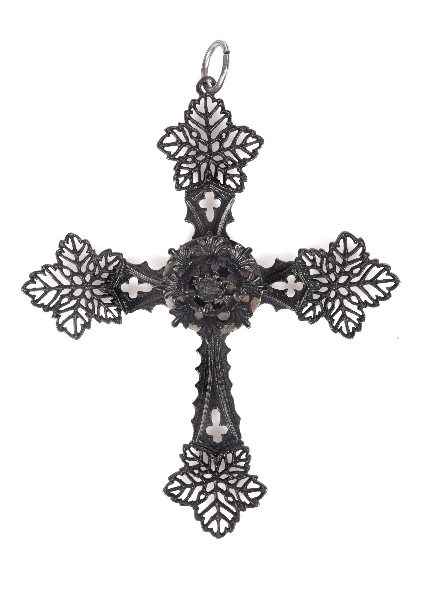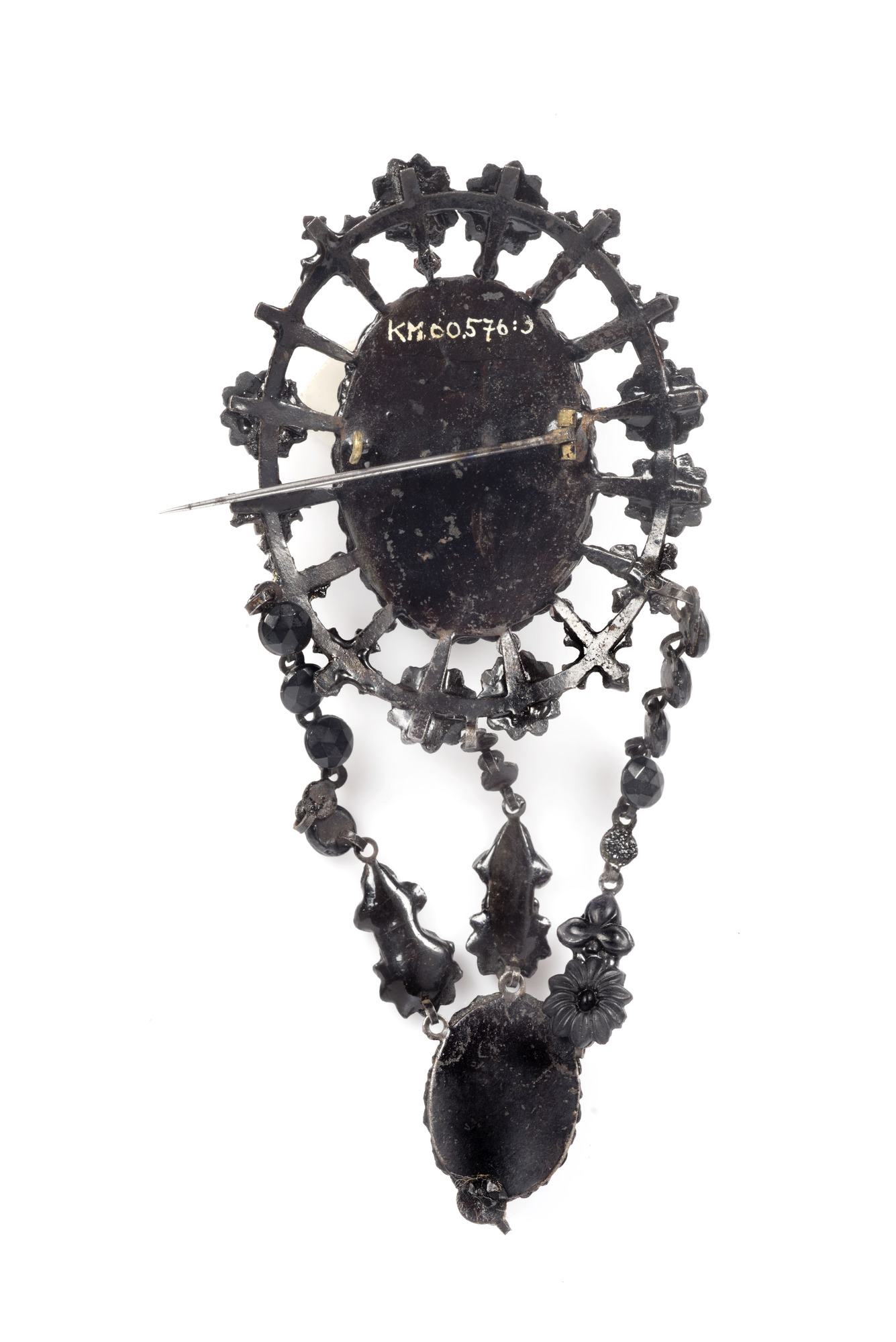 Svart. Brosch med kvinnobyst och kedjor, örhängen med kvinnobyst och kors, stort hängkors.