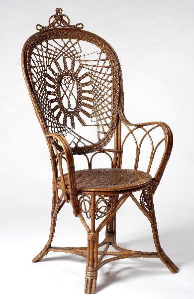 Omålad. Sabelformade ben, rundade armstöd, ryggen med radiellt flätverk, i mitten en oval med sammanflätade åttor, längs kanten en enkel fläta, spetsigt krön. Slåar, x-kryss. Nygotisk stil.