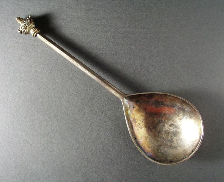På skedens baksida är två B:n graverat över heraldiska vapen. Det vänstra föreställer en båt. Det högra är mer svårtolkat. Möjligen föreställer det gäddkäkar, nosklämmeskänklar eller ekoxens klor. Inskriptionen avser troligen Sven Bäk (son av Nils Krumme) och hans första hustru Kristina Bengtsson av ätten Guse (förde en båt i sitt vapen). Skeden är funnen i en damm anlagd under 1570-talet och i bruk fram i 1600-talets andra hälft. Dammfynd.