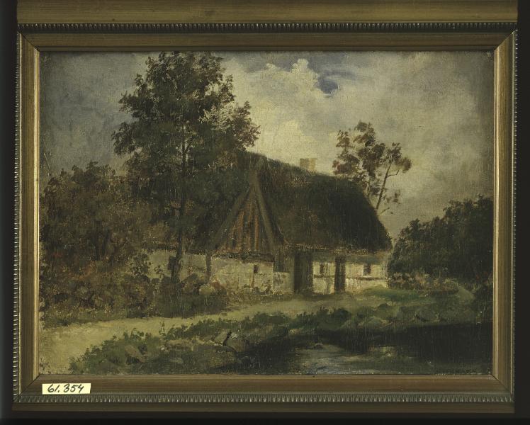 Korsvirkeshus vid väg och å, omgivet av träd. På baksidan texten Bondstugan II, Skånsk bondgård II före 1870. Duk på träskiva.