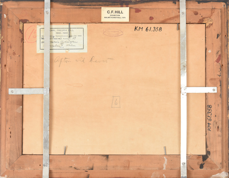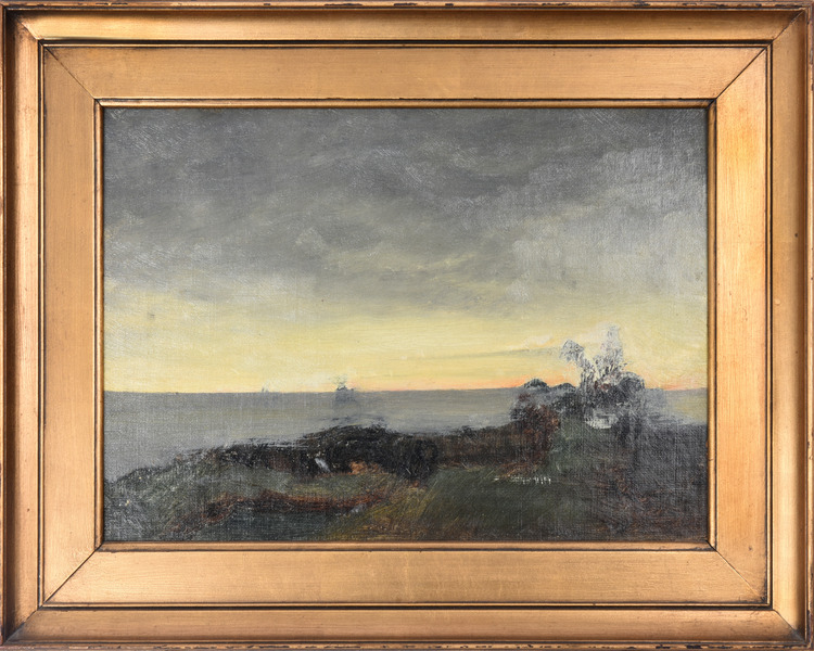 Utsikt över havet. Klippig strand i förgrunden. Motivet kan vara hämtat ur minnet från vistelse vid Franska kanalkusten. På baksidan text Afton vid revet och utsikt vid Öresund. Duk på papp.
