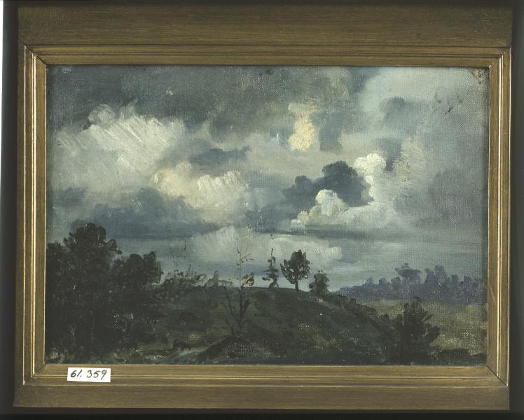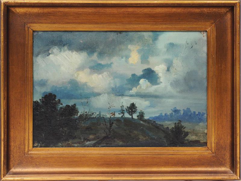 Månskenslandskap. Kullar och gles skog. På baksidan text Månskenslandskap. Duk på papp.