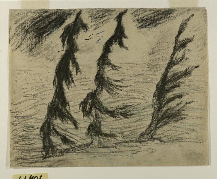 Tre granar i blåst. Färgkrita.
