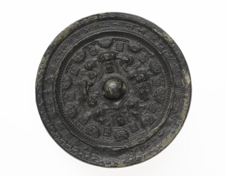 4 sittande människofigurer med djur mellan sig, omgivna av kvadrater och halvcirklar. I kanten kinesiska tecken.