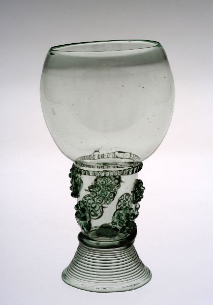 Av ljust grönaktigt glas. Noppor på kuppans nedre cylindriska del. Foten svagt utsvängd, uppbyggd av tunna trådar.