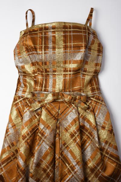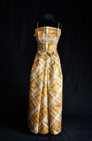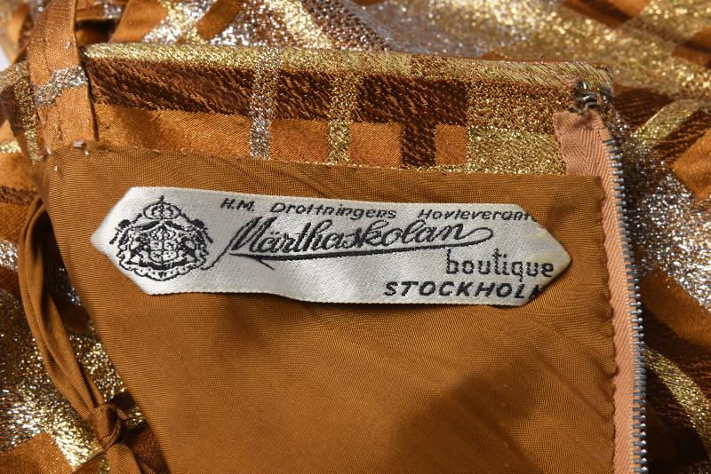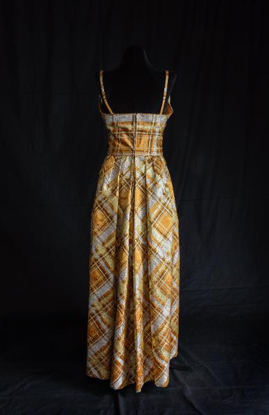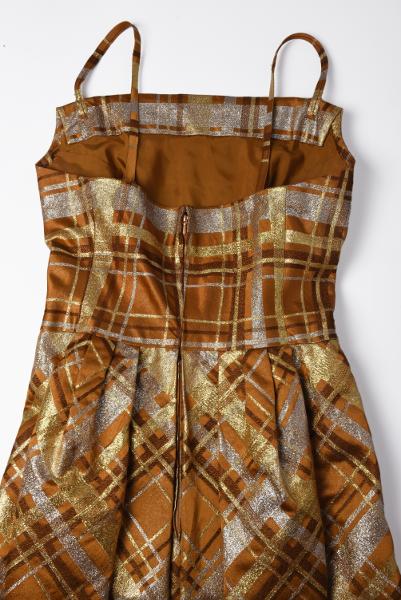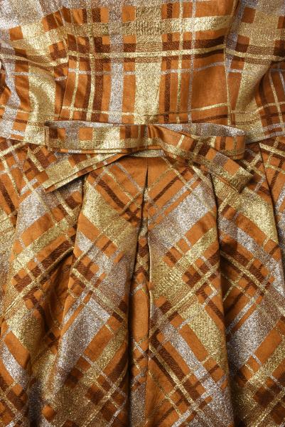 - Rutig. Brunt siden med rutränder i guld, silver och mörkbrunt. Hellång. Avskuren i midjan med lagda veck. Rosett av tyget mitt fram. Rakt avskuret liv med smala axelband. Blixtlås i ryggen. Konfektion.