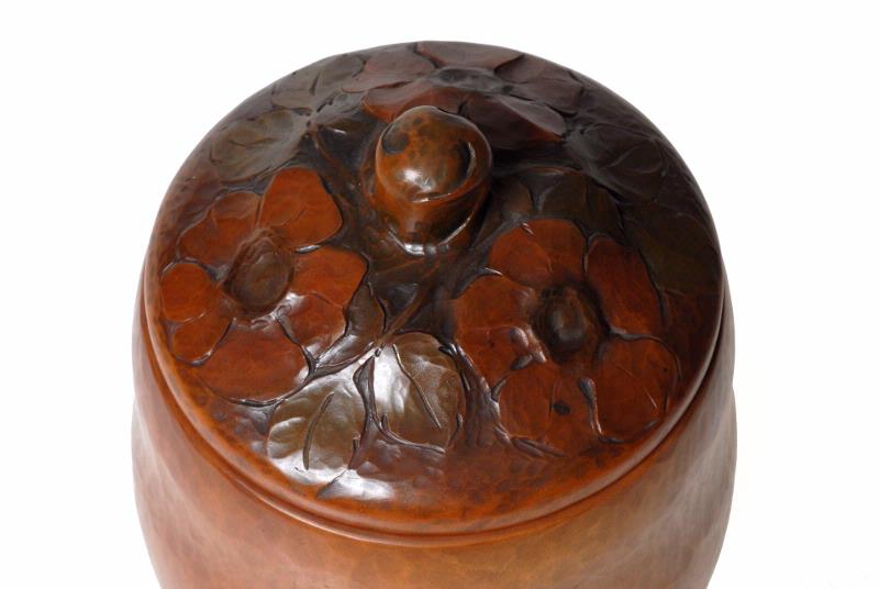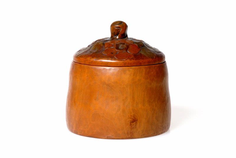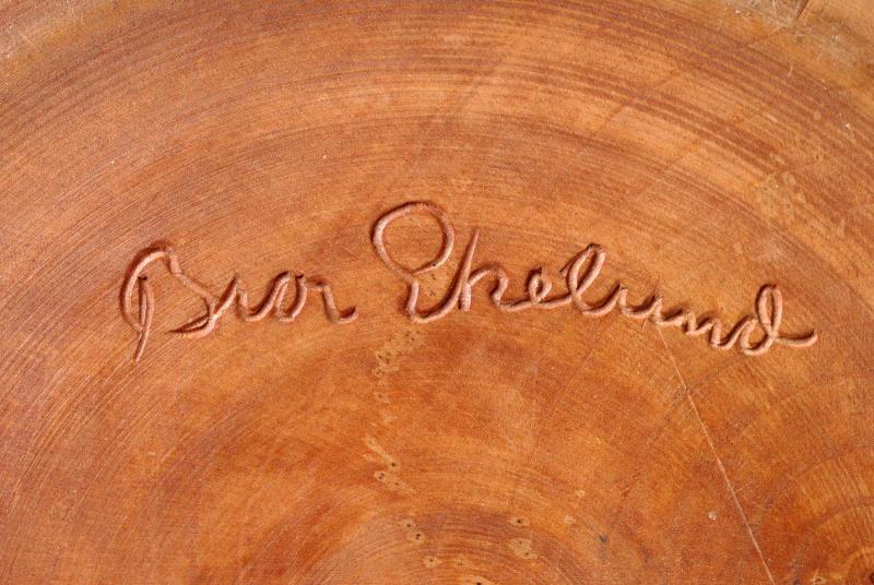 Utskuren i björk med blommor på locket. Märkt "Bror Ekelund".